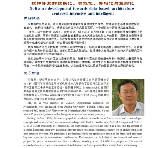 4月13日,由研究生院主办,计算机院承办,邀请了李海宽教授做了题为“软件开发的数据化、智能化、架构化与集约化”的讲座,在讲座中,李海宽教授着重介绍了大数据时代软件开发模式的变化、特征及其发展趋势。