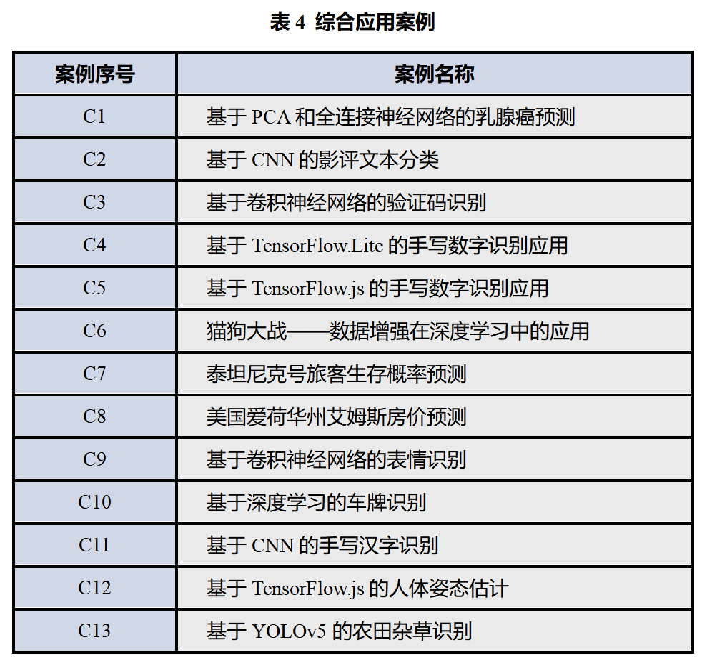 使用案例库展开教学,有利于将理论与实践应用相结合,引导员工从主动获取专业知识、发现问题、分析和解决问题,培养运用理论和方法解决实际问题的能力,从而提高新工科专业员工的人工智能实践应用能力,培养创新能力,充分发挥员工主观能动性,满足综合能力培养目标达成度要求,达到技能与知识、方法与过程的统一,对于切实提升工程教育人才培养质量具有广泛的应用前景价值和重要的现实意义,本案例中所包含的资源简介如表1所示: