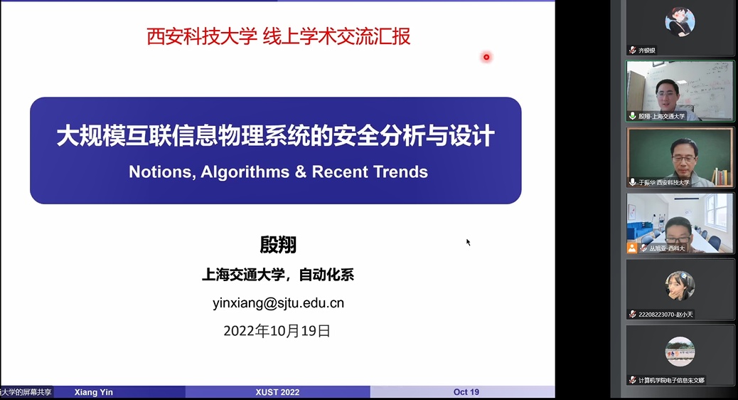 10月19日,上海交通大学副教授殷翔受邀为bevictor伟德官网师生作了题为《大规模信息物理系统的安全分析与设计》的学术报告。本次报告采用腾讯会议形式线上进行,公司经理于振华教授主持,校内外近两百名师生聆听了报告。