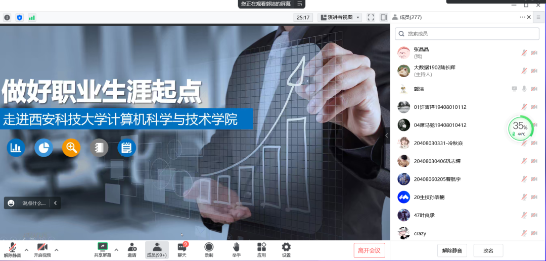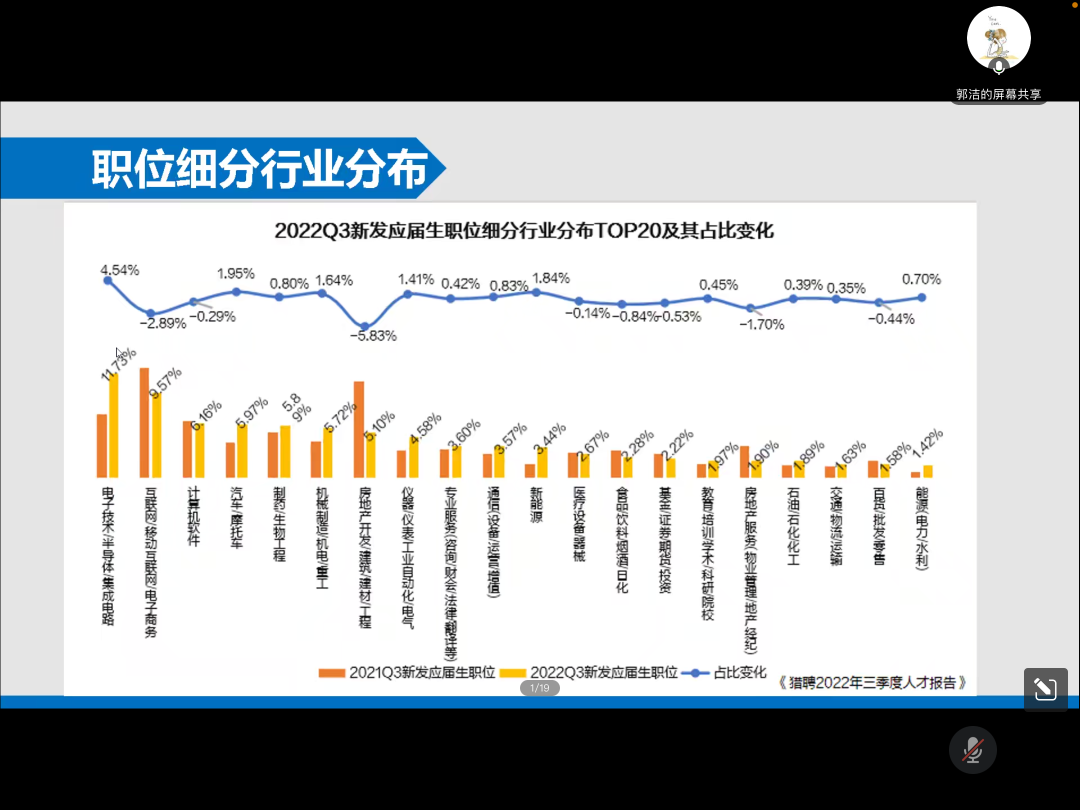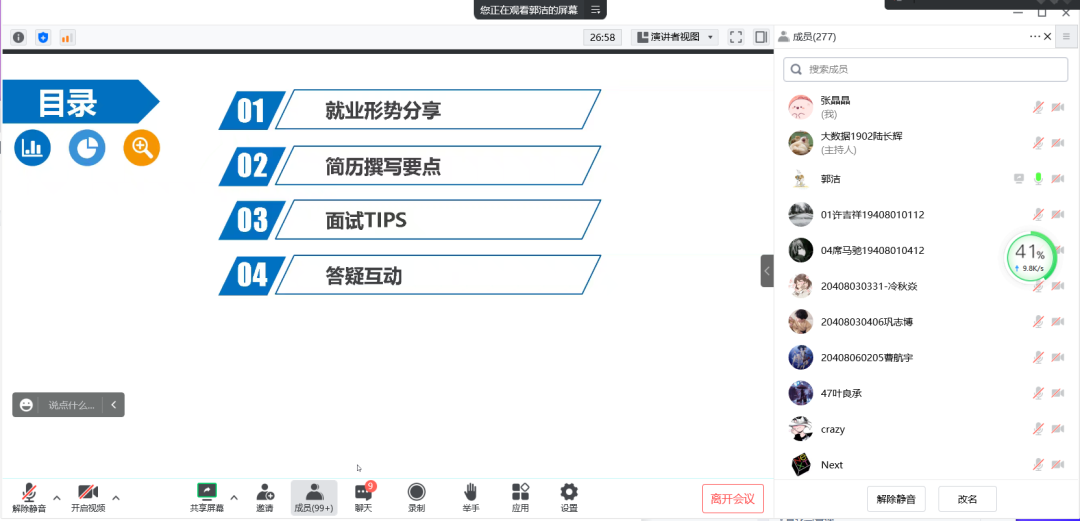 郭洁结合毕业生增幅、秋招行业变化、职位细分行业分布等对就业形势进行了分析,讲解了简历撰写的要点、面试中需注意的问题,通过职业生涯起点的三个问题、职业生涯的认识思考等为毕业生给出了很好的建议。最后,郭洁与员工们进行了线上答疑互动。