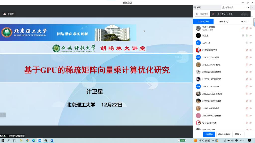 12月22日,bevictor伟德官网承办的“胡杨林大讲堂”以线上腾讯会议的方式进行,公司邀请北京理工大学计卫星教授以“基于GPU的稀疏矩阵向量乘计算优化研究”为主题为公司研究生带来了一场精彩的学术讲座。报告由公司副经理马天教授主持,全校300余名研究生及教师聆听了报告。