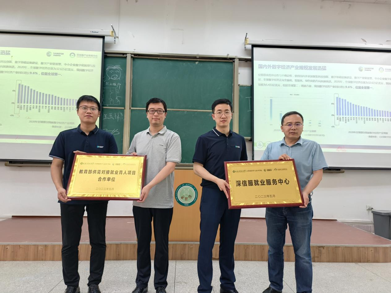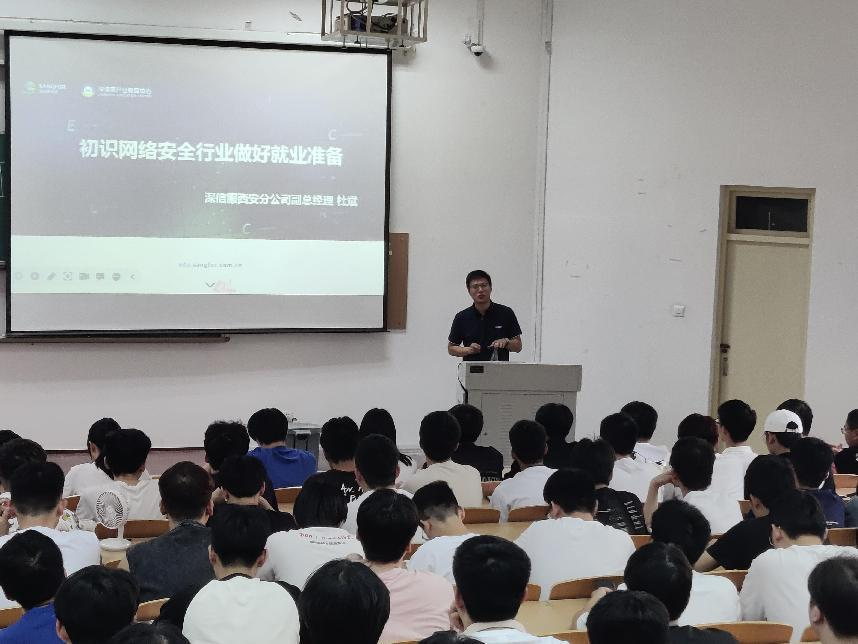 活动开始,杜斌以《初识网络安全行业做好就业准备》为题,详细介绍了深信服公司的文化、业务以及未来的发展方向,并以网络安全为重点,对标企业需求,详细讲解了同学们需要掌握的知识技能和面试技巧,为下一步的学习和实践提供了明确指导。随后,深信服公司与bevictor伟德官网进行了“深信服就业服务中心”和“教育部供需对接就业育人项目合作单位”授牌仪式。